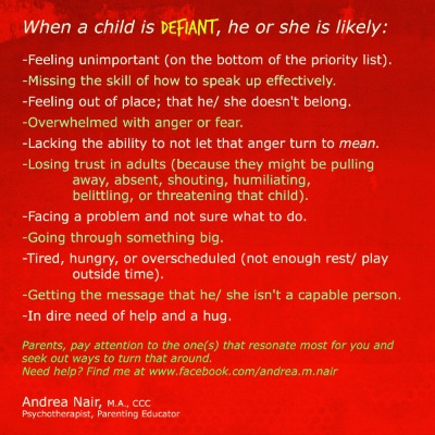 Look at misbehaviour as communication gone sideways. Consider what is happening in your child’s world that might be causing distress, sadness, or anger. A child acts out when he is experiencing an overwhelming situation and/or overwhelming feelings and doesn’t have the skills to handle it and calm down on his own.